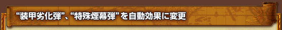 | 戦闘用のオプションスキル“装甲劣化弾”、“特殊煙幕弾”の有用性が向上するよう、行動力を消費して効果を発動するタイプから、自動効果に変更されます。 |