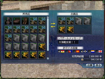 “大海戦”期間中(対象街決定投票開始時から終盤戦終了時まで)、国家を指定してバザールを出店できるようになります。“大海戦”支援のため、自国と連盟国のプレイヤーキャラクターだけに物品を供給したい時などにご活用ください。 |