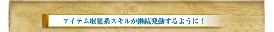 アイテム収集系のスキル“採集”、“調達”、“探索”について、その都度スキルを使用しなくても、一度使用すれば、以降、継続的に行動力を消費しながらスキル効果が発動するようになります。 なお、これらのスキルの継続発動の回数が実時間で1日あたり合計600回(連続して行った場合、約1時間)を超えると、冒険経験を獲得できなくなります。 ※本アップデート内容に関する詳細な情報を「開発チームDelfinより」に掲載しておりますので、併せてご参照ください。