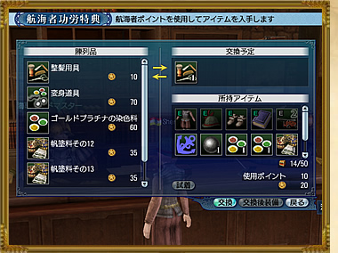 これは『大航海時代 Online』にて「プレイチケット」の適用時に、“航海者ポイント”という特別なポイントが貯まっていき、このポイントと引き換えに様々なゲーム内アイテムを獲得できる、といったサービスです。