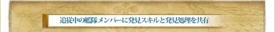 従来から、艦隊メンバー間の距離が近い場合には、探索や視認といった発見スキルの共有が可能でしたが、追従状態・追尾状態であれば、艦隊メンバー間の距離に関わらず発見スキルを共有できるようになります。 これにより、さらに艦隊(パーティープレイ)での冒険をしやすくなります。 |