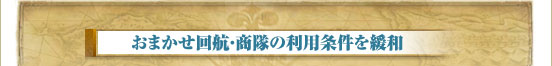 「@モバイル+@Web」サービスの“おまかせ回航”について、交易品を積んだ状態で回航できる[ 商隊を雇う ]と[ 武装商隊を雇う ]の必要熟練度を引き下げ、移動に必要な回航許可証の枚数を軽減します。