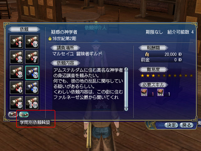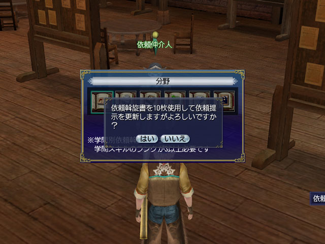 冒険ギルドのNPC“依頼仲介人”に、希望の依頼を受けやすくする“学問別依頼斡旋”機能が追加されます。《依頼斡旋書》10枚で、必要な学問を指定して斡旋を受けられるようになります。