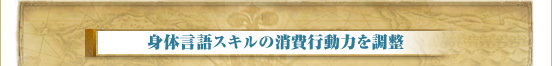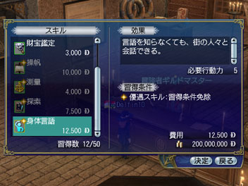 身体言語スキルの消費行動力を調整します。さらに冒険者見習、商人見習、軍人見習の優遇スキルに、身体言語スキルを加えます(各種ギルドマスターから習得できます)。