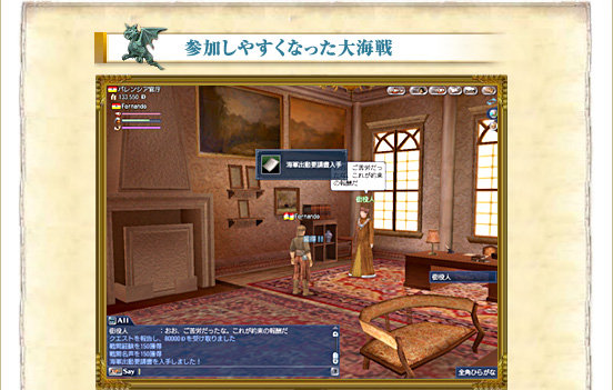 また、大海戦の報酬額も大幅アップ。任務達成者には「海軍出動要請書」が授与されます。 |