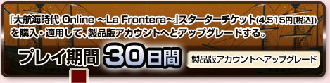 開催期間中に『大航海時代 Online 〜La Frontera〜』スターターチケット(4,515円[税込])を購入・適用して、体験版アカウントもしくはネットカフェアカウントから、『大航海時代 Online 〜La Frontera〜』製品版アカウントを取得された方 |