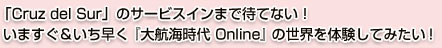 本キャンペーン期間中に『大航海時代 Online 〜La Frontera〜』を始められた方が、8月22日にサービスを開始する拡張パック第2弾「Cruz del Sur」に移行される際には、別途「Cruz del Sur」アップグレードチケット(2,940円[税込])が必要となりますが、本キャンペーンには60日分のプレイ期間(3,150円[税込]相当)が特典として付与されるため、お得な内容となっております。 |