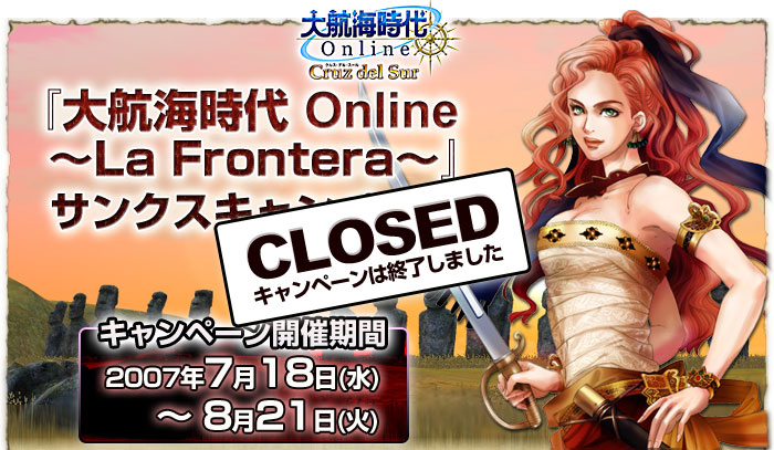 | なお、『大航海時代 Online 〜La Frontera〜』スターターチケットの販売は、2007年8月21日(火)のメンテナンス開始時間をもって終了となります。本キャンペーンをご利用いただく場合には、メンテナンス開始前に余裕を持って、スターターチケットの購入・適用を済ませてください。 |