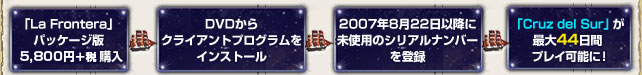 パッケージ版同梱のDVDに収録されているクライアントプログラムは、「La Frontera」対応版ですが、「Cruz del Sur」のサービス開始時をもって、自動更新により「Cruz del Sur」対応版にアップデートされます。 |