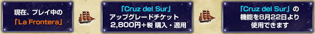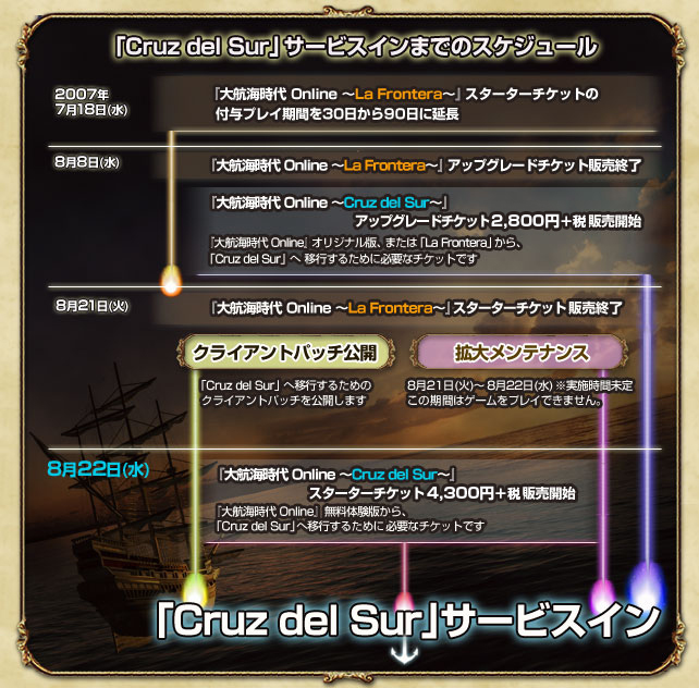 「La Frontera」から「Cruz del Sur」へ移行する場合は、『大航海時代 Online 〜Cruz del Sur〜』アップグレードチケット(2,800円+税)をご購入ください。このアップグレードチケットは、2007年8月8日(水)のGAMECITYメンテナンス終了後より先行発売する予定です。アップグレードされずに課金を継続された場合は、「La Frontera」を引き続きお楽しみいただけます。