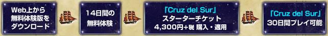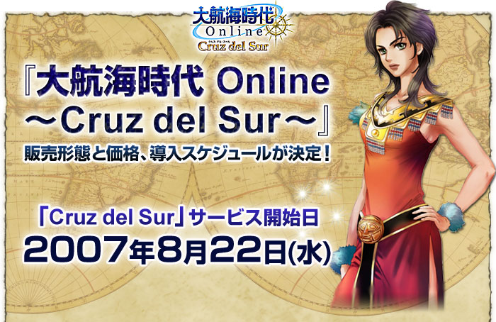 14日間の無料体験期間中、もしくは体験期間満了後に、『大航海時代 Online 〜Cruz del Sur〜』スターターチケット(4,300円+税/プレイ期間30日間付き)をご購入いただくと、「Cruz del Sur」の新機能と「La Frontera」の内容をお楽しみいただけるようになります。このスターターチケットは、2007年8月22日(水)のGAMECITYメンテナンス終了後より発売する予定です。