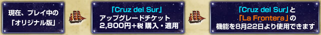 オリジナル版から「Cruz del Sur」へ移行する場合は、『大航海時代 Online 〜Cruz del Sur〜』アップグレードチケット(2,800円+税)をご購入ください。これで「Cruz del Sur」と「La Frontera」の両方の内容をお楽しみいただけます。このアップグレードチケットは、2007年8月8日(水)のGAMECITYメンテナンス終了後より先行発売する予定です。アップグレードされずに課金を継続された場合は、『大航海時代 Online』オリジナル版を引き続きお楽しみいただけます。