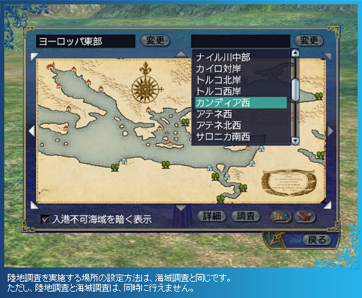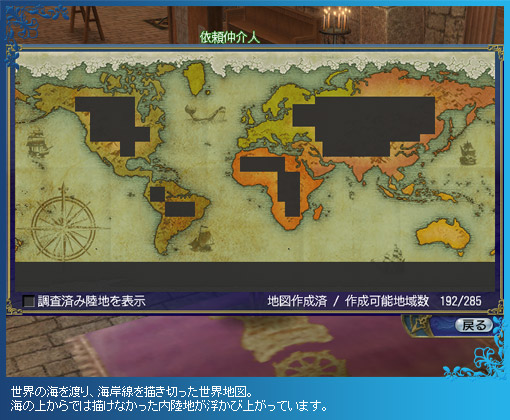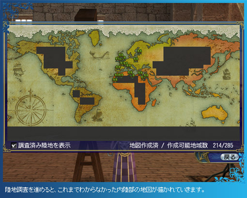調査が完了した陸地は、世界地図に表示させられます。一部の陸地では世界地図の空白が埋まり、隠されていた内陸部が明らかになることも……。