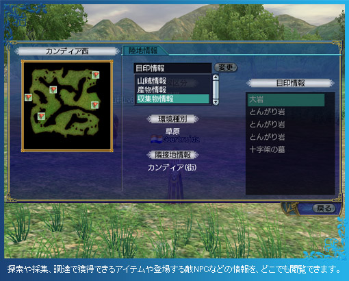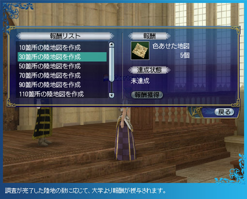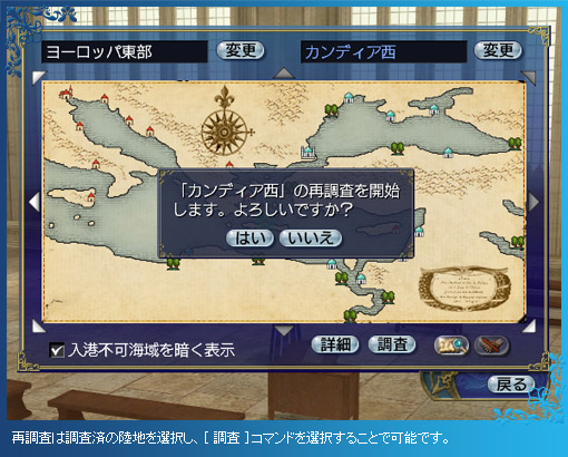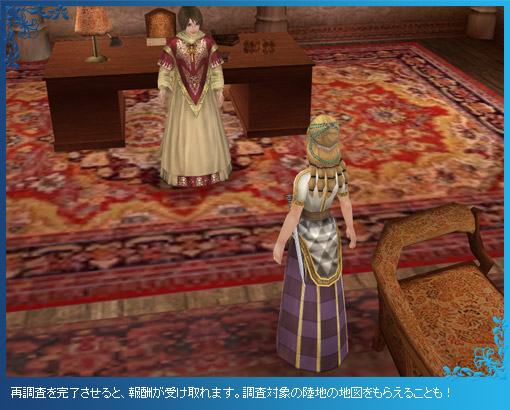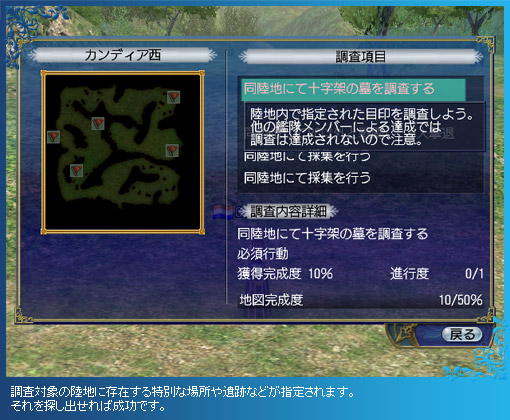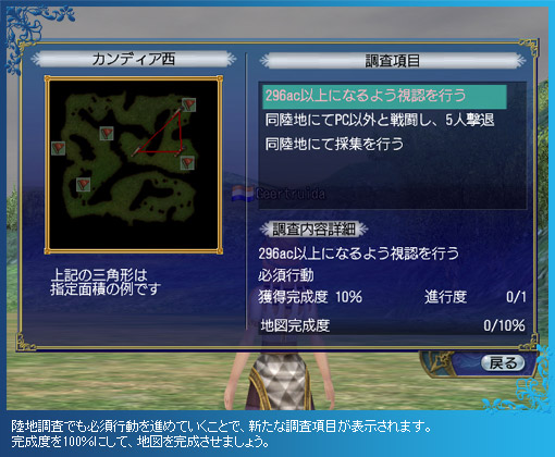 なお、陸地は人々の暮らしや天候によって、日々変化が起きているため、すでに調査を済ませた場所の再調査も歓迎されます。再調査を完了させると、特別な報酬も手に入るので、時間に余裕がある時や、仲間の陸地調査を手伝う時には、積極的に再調査をしてみましょう。