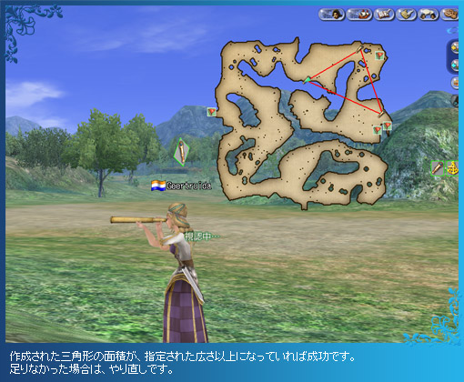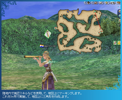 三点視認は三角測量に似た調査です。三角形の面積を利用して、陸地を調査します。