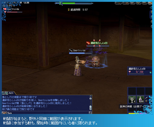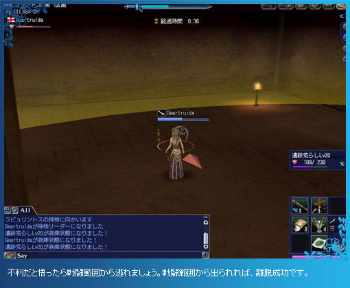 大迷宮内には冒険者に敵対する者が多くあり、彼らに見付かると攻撃されてしまいます。通常フロアでの戦闘は一定の範囲内で行われ、離脱することもできるので、不利な状況に置かれたら無理せず退きましょう。