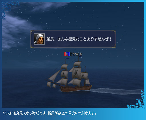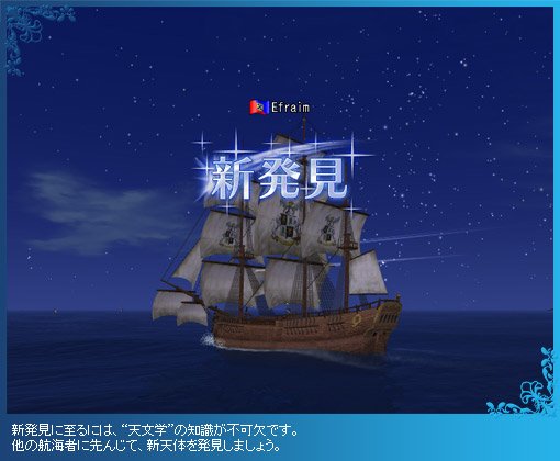 新天体は通常の“天文学”の発見物同様、【発見可能な海域】で【特定の時間帯】に【“視認”を行う】ことで発見できます。発見可能な天体や海域は、日を追って変化します。また、新天体は“新発見”する場合と、他の航海者が報告した後に“通常発見”する場合があります。