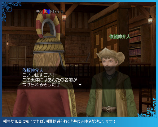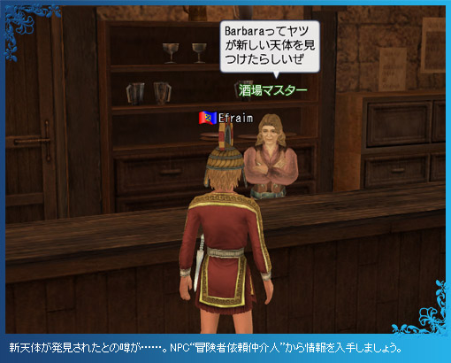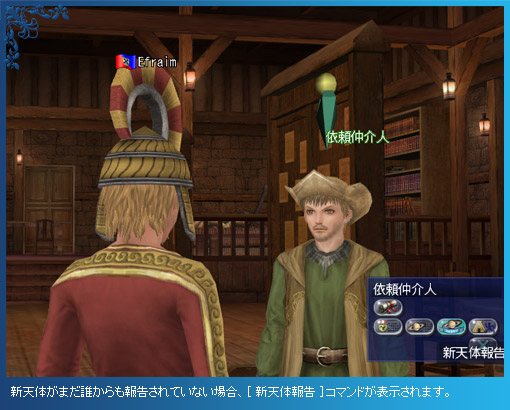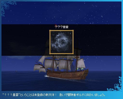 そして新発見した際は、すぐに冒険者ギルドに向かい、冒険者依頼仲介人に報告しましょう。というのも、この新発見をギルドに報告して初めて、“あなたが発見した天体”として登録されるからです。この際、ほかの航海者に先を越されると、“その航海者が発見した天体”として登録されるため、あなたの新発見の報告は受理されません。第一発見者となるべく、急いでギルドに向かいましょう。