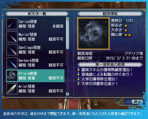 新天体を新発見、もしくは通常発見した際には、スキル熟練度と冒険経験値をその場で獲得できます。