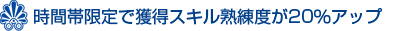 実施期間中、毎日20時から24時までの間、スキル熟練度の獲得量が20%上昇します。
