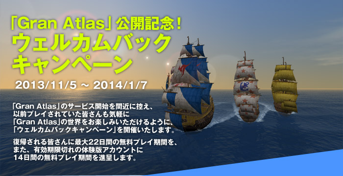 上記期間中、対象者が『大航海時代 Online』に復帰された(ログインされた)場合、5日間の無料プレイ期間をプレゼントします。また、復帰された後に「プレイチケット」を購入され、アカウントの有効期限を延長された方には、さらに無料プレイ期間をプレゼントします。