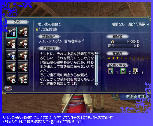 上の写真では、依頼名の下に“15世紀第2期”と記されていますが、これがこのクロノクエストの対象年代となっています。つまり、依頼“思い出の首飾り”を達成すると、15世紀第2期の年代を把握した者(=時を知る者)として認められます。