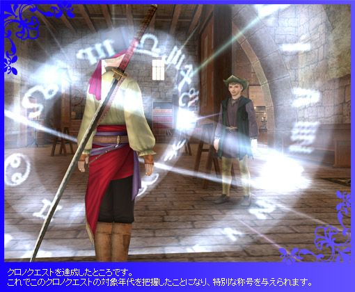 まとめると、特殊な依頼である“クロノクエスト”は、達成すると称号“時を知る者”を獲得でき、その称号を名乗ることで、把握した対象年代の要素が現年代に加わる、というものです。