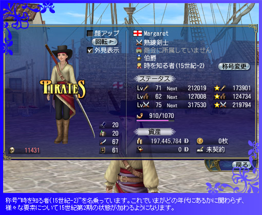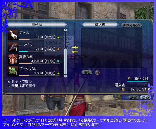 例えば、現在のワールドクロックが16世紀第5期にあるとします。その場合でも、称号“時を知る者(15世紀-2)”を名乗れば、交易品やガナドールに、16世紀第5期のものに加えて15世紀第2期のものが現れてくるのです。