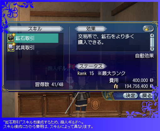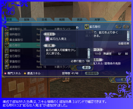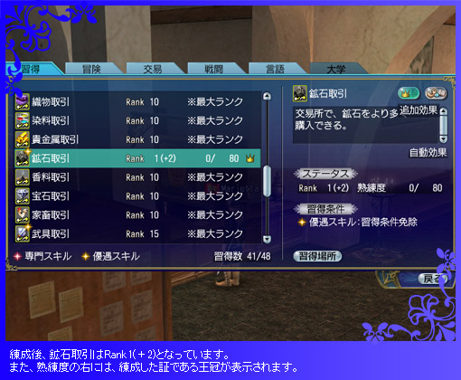 なおスキル練成を行うと、そのスキルのランクは1に戻ってしまいますが、再度鍛える際に必要な熟練度は軽減されます。