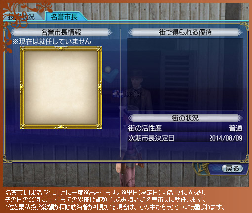 また、名誉市長が就任している街で、航海者が街の機能を利用すると、街の“活性度”が上昇していきます。この活性度が条件を満たすと、名誉市長には報酬が与えられます。報酬は週に一度、NPC“街役人”から受け取れます。