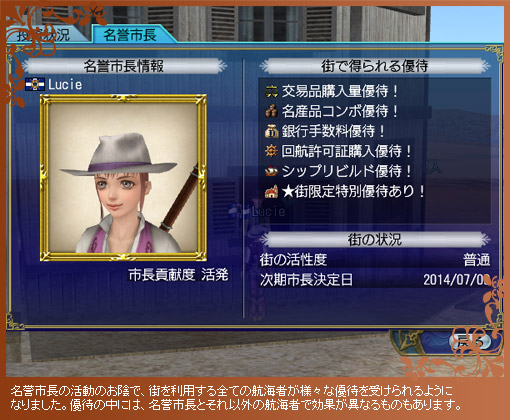 同盟港へ最も多額の投資をした航海者が、その街の名誉市長に就任するようになります。名誉市長がいる街では、市長の活躍に応じて様々なメリットが発生します。