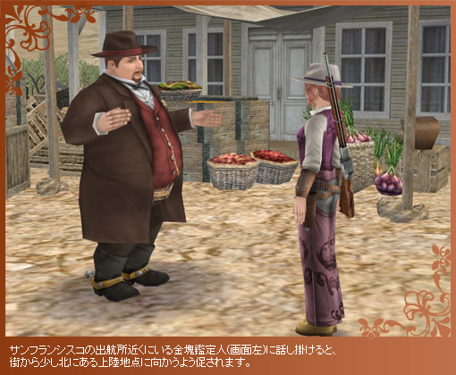 ゴールドラッシュへの参加は、サンフランシスコのNPC“金塊鑑定人”と話すことから始まります。金脈を見付け出し、多くの金塊を掘り当てるべく、行動開始です。