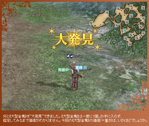 フィーバータイム中は、ごくまれに《大型金塊》を発見できます。《大型金塊》は、金塊と違って換金はできないものの、様々なアイテムとの交換に利用できます。交換時には“重さ”が鍵を握るようです。