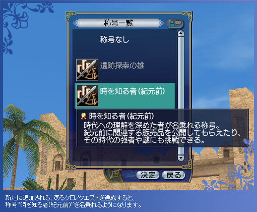 “クロノクエスト”で得られる称号に、新たな時代“紀元前”が追加されます。この称号を名乗ることで、古代バビロニアにまつわる謎に挑戦できます。