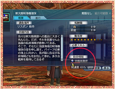 こうして、“到達度”が目標値以上に貯まった状態で報告を行うと、 晴れて入港許可状をもらうことができる。 すなわち、いち早く新天地の入港許可を手に入れるには、 いかに国民で一致団結するかが鍵となってくる。 君自身の活躍が自分だけでなく、同胞たちの入港許可獲得に繋がり、 ひいては祖国の新天地進出を活発にする、というわけだ。