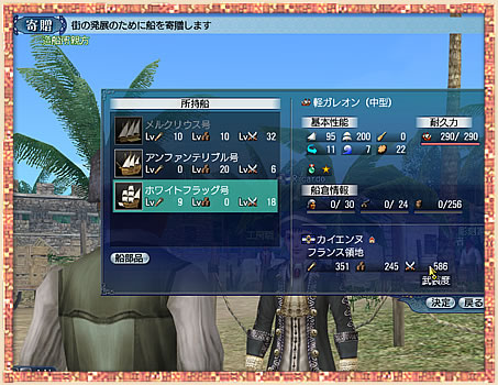 この値を上げ、街を発展させるには、従来の投資のように 多額の金銭を投じればよいというものではない。 各発展値に即した物を、「道具屋主人」「造船所親方」「街役人」に納める必要があるのだ。 たとえば、