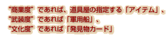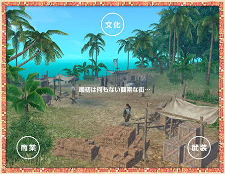 こうした、そなたら航海者の貢献により、各開拓地は1週間ごとに、 その週の“発展値”の推移に応じ、姿を変えていくことになる。 “文化度”が高ければ“学術都市”に。“商業度”が高ければ“交易都市”に。 “武装度”が高ければ“軍事都市”になるといった具合にな。