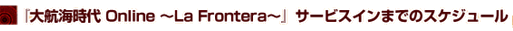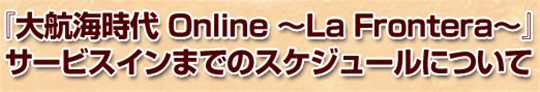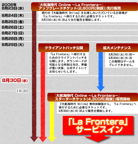 『大航海時代 Online 〜La Frontera〜』のサービスインに際しましては、多数のお客様がチケットの購入、並びにクライアントプログラムのダウンロードを行うことにより、大変な混雑が予想されております。そこで、下記の日程にて、チケットの前売、及び拡大メンテナンスを実施いたします。