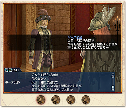 所属国家の本拠地、出航所に立ち寄ると大臣からの呼び出しが掛かります。大臣に話し掛けると"世界周航レース"の開催が通達されます。 |
