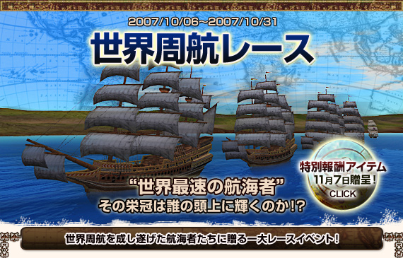 | "世界周航レース"終了時点(2007年10月31日(水)の定期メンテナンス開始時)で、各ワールドのレース結果上位20位以内の方には、11月7日(水)の定期メンテナンス時に特別報酬アイテムをお届けします。特別報酬アイテムはゲーム内の銀行に届き、[アイテム受領]コマンドで受け取れます。 |