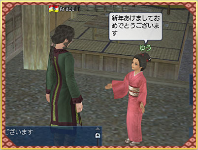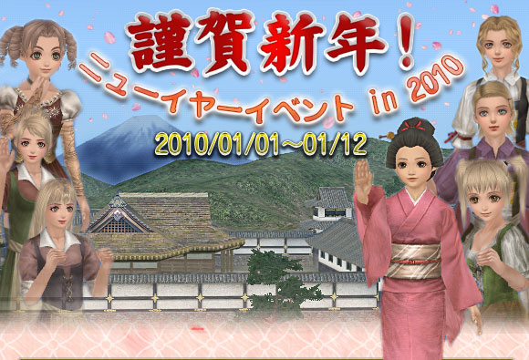 そこで今年は、「新たな年をジパングで祝おう!」ということで、恒例の「ニューイヤーイベント」をジパングで開催いたします! ジパングの街にお手伝い娘たちが現れ、皆さんの2010年"初船出"のお祝いとして、ジパングにちなんだアイテムをプレゼントしてくれます。 |
