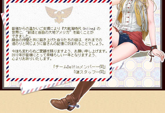 ・ゲームマスター(GM)が2012年1月1日(日)から1月4日(水)までの間、各国本拠地などを訪れ、航海者の皆さんへ新年のご挨拶をいたします。GMは赤い鎧が目印です。