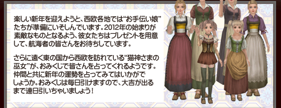 ・西欧6ヶ国の本拠地に登場するNPC"お手伝い娘"に話し掛けると、新年を祝うアイテムを受け取れます。
