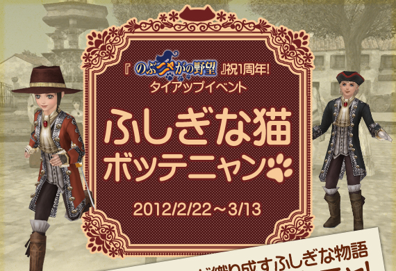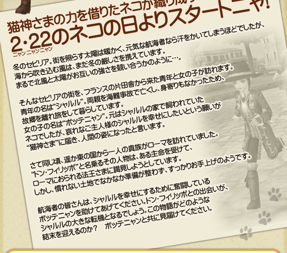 昨年に開催した「2・22スタートキャンペーン」において、『大航海時代 Online』に登場してほしい"ねこ武将"のアンケートを行いました。そこで見事1位を獲得した"織田のぶニャが"が、新たなペットとして登場します! 本イベントを進めていくと"織田のぶニャが"のペット権利書を獲得できます。 ※本イベント進行中に報酬を獲得できます。 ※ペットを飼育するには「Cruz del Sur」以降の製品版アカウントが必要です。 |