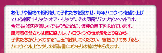 - 2. 団長は子供たちをびっくりさせるものを求めています。ハロウィンの伝承をたどり、彼の求めるものを探しましょう。依頼を達成すると報酬を獲得できます。