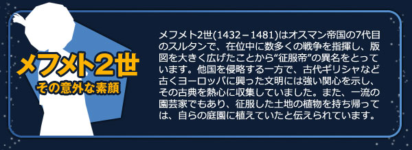 このメフメト2世は力を隠している状態です。メフメト2世との戦いに1度でも勝利を収め、歴史スペクタクルイベント「征服帝降臨!」を達成させると、強さを増したメフメト2世に挑戦できるようになります。