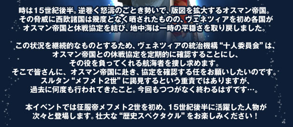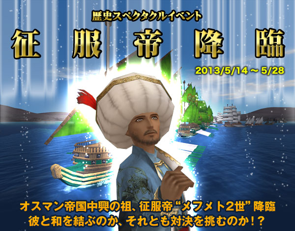 本イベントの開始時より5月28日(火) 定期メンテナンス開始時(10:30予定)まで、メフメト2世がガナドール戦に登場します。メフメト2世との戦いは難度を低く設定しています。「ガナドール戦は難しそう」と思っている方も、入門編として是非お試しください。