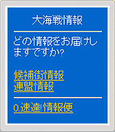 ・ 大海戦開始から次回大海戦の攻略目標街投票開始までの期間、勝敗、勝率、勝利ポイント、街への影響度、戦績優秀者を見ることができます。