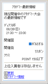 ・ 開催中の大会について、大会名、開催日時、開催国、開催街、クラス、上位入賞者、勝利数を見ることができます。