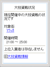 ・ 開催中の大投資戦について、対象街、開催時間、総投資額ランキングを見ることができます。